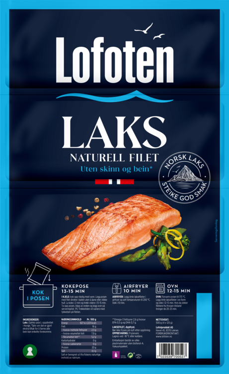 Lofoten Laks Naturell består av fire dypfryste fileter uten skinn og bein, laget av fersk, norsk oppdrettslaks. Fisken har et naturlig høyt innhold av omega-3-fettsyrer.