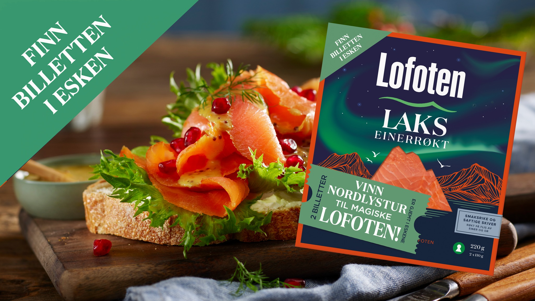 Vi har gjemt to billetter i nordlyseskene med Lofoten Einerrøkt Laks og Einerrøkt Ørret. Er du den heldige og finner en av de to billettene, vinner du et reisegavekort for to til Lofoten!